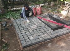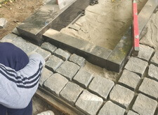 Начинаем укладывать брусчатку, параллельно монтируя цветник из гранитных балок. Кое-где целые квадратики не помещались, поэтому нам приходилось распиливать существующую брусчатку на более мелкие части.