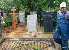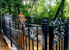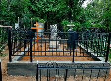 Затем наступил самый ответственный этап работы: монтаж ограждение. Работа по его установке опять-таки заняла достаточно долгое время, однако в результате чего по периметру могилы была установлена достаточно высокая статусная металлическая ограда, сразу же выделяющая место захоронения на фоне других участков. На фотографиях ниже представлен окончательный внешний вид могилы с разных ракурсов на момент завершения работ.