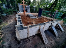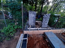 Вкопанные ранее сваи послужили великолепной основой для металлического каркаса, который мы и сварили прямо на территории места захоронения. Каркас был установлен по периметру участка с целью придать дополнительную жёсткость опалубке.