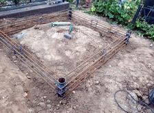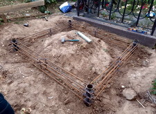 Завершив подготовительные работы, мы перешли непосредственно к могиле. Предварительно демонтировав уже установленную оградку и обе таблички, мы вырыли траншею по периметру участка. В каждый угол получившегося квадрата мы вкрутили сваи, которые послужили опорами каркаса из арматуры. Такая конструкция придаст бетонному цоколю необходимую жёсткость, обеспечит прочность, а также исключит вероятность провалов и перекосов.