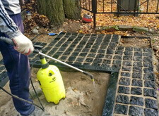 Первый этап работы – очистка и подготовка места захоронения к дальнейшим работам. Мы вынесли памятник, срезали старое ограждение, очистили землю от травы и иного мусора. Далее разметили площадь участка и укрыли её геотекстилем.