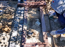 Далее приступаем к установке подставки памятника. После того, как она была возвращена на своё место, размечаем цветник. Параллельно работаем с периметром могилы: по краю пускаем металлическую планку, которая послужит границей брусчатки.