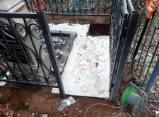 Тем временем мы изготовили табличку, закрывающую лицевую сторону надгробья, а также православный крест, венчающий памятник. Установка этих элементов завершила реставрацию памятника и мы взялись за укладку гранитной брусчатки, оставив в одном из углов участка место под квадратную клумбу. Брусчатку замыли водой и оставили высыхать, в цветник же насыпали мульчу. Окончание работ на данном месте захоронения происходило в тёмное время суток, так как для заказчика срочность благоустройства была одним из решающих критериев при выборе мастеров.