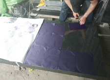 Переходим к созданию портретов на гранитной поверхности. Распечатываем ранее созданный макет, прикладываем его к плите. Под него кладём кальку, обводим ручкой основные линии портрета, убираем всю бумагу. Для проявления линий посыпаем камень тальком.