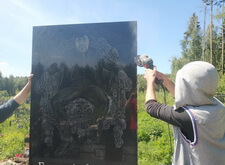 Следующий этап – один из самых ответственных в работе. Плиту, весящую порядка 600 килограмм, требовалось доставить на место захоронения. Для этого понадобились объединённые усилия более чем двадцати человек.